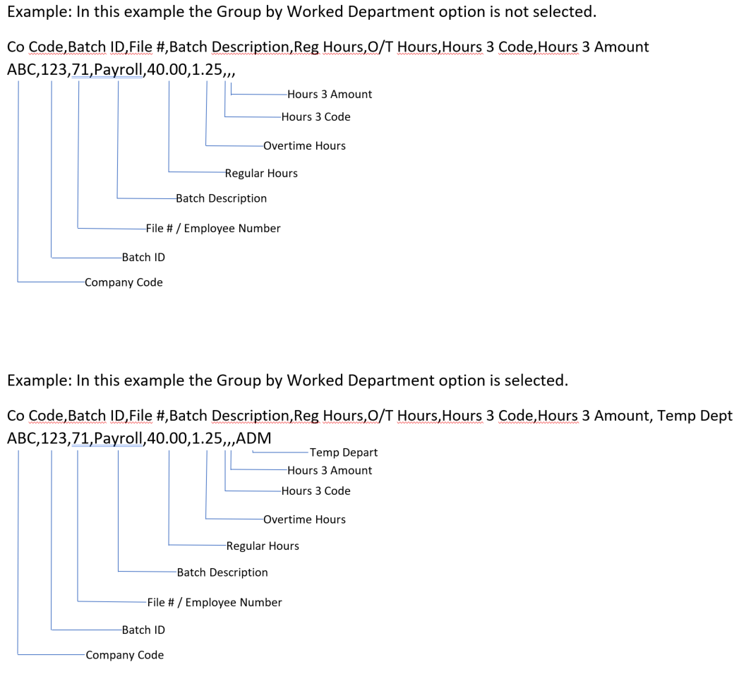 - Data Records – The second record and all that follow are the data records. The data records contain the actual data for the fields listed in the header record which will include the user defined fields based on the mapped pay codes used. Note: Additional Hours 3, Hours 4 and Hours 5 items may be present depending on how many pay codes were mapped.